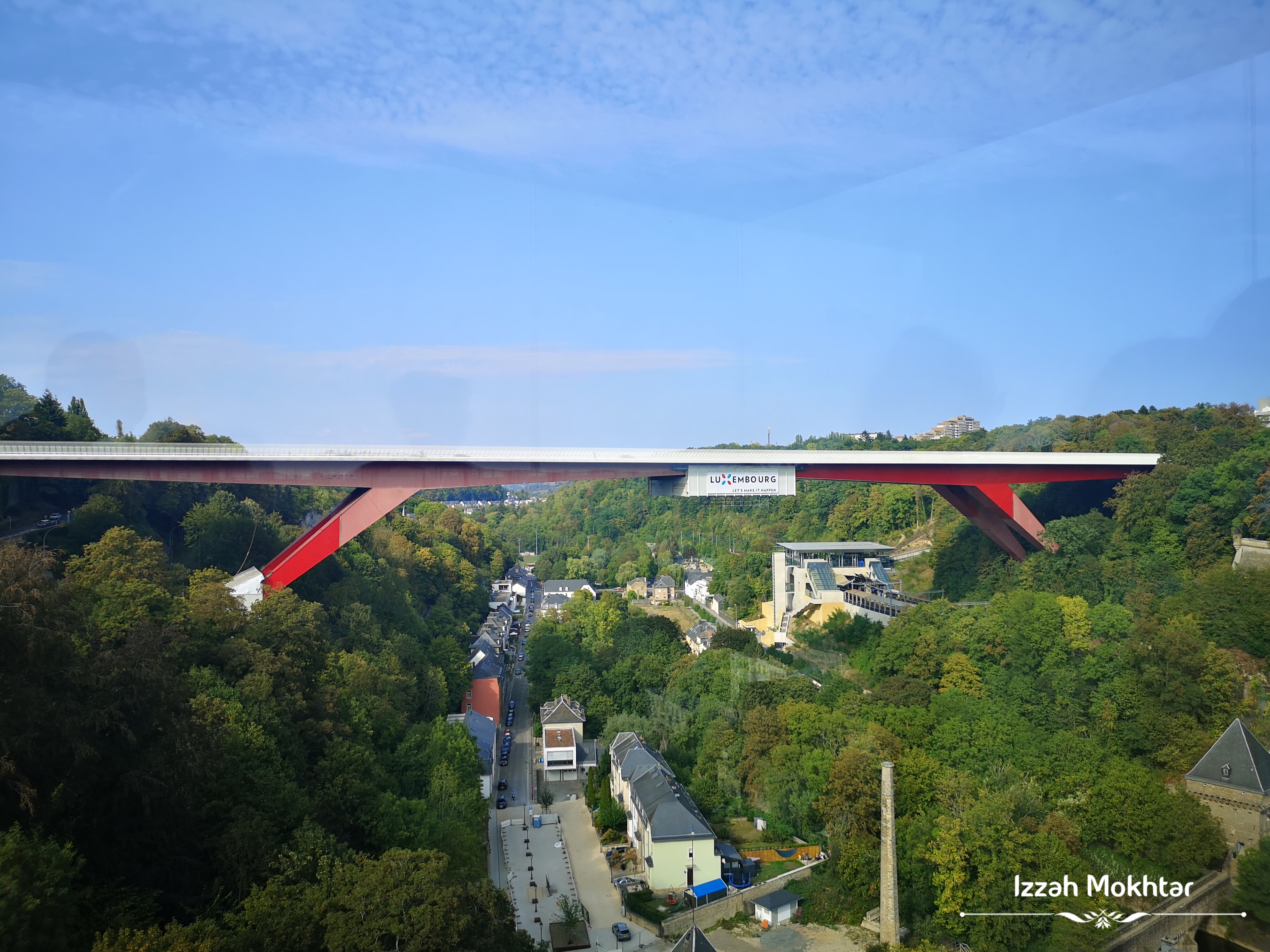 Memandangkan sepanjang perjalanan ke kawasan Pfaffenthal Lift ni memang dok nampak jambatan merah tinggiiii tu ja, nak tengok jugak dari bawah dengan lebih dekat. Turun balik lift ke bahagian bawah bandar dan mula cari jalan yang paling dekat dengan jambatan tu. Jambatan ni menghubungkan city center bahagian atas dengan European Quarter di Kirchberg. Nampak tak orang tengah jalan kaki kecikkk ja kat atas tu?
